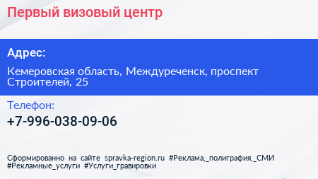 Первый визовый центр по адресу Кемеровская область, Междуреченск, проспект Строителей, 25 в дальнейшем Организация, размещена в следующих категориях: