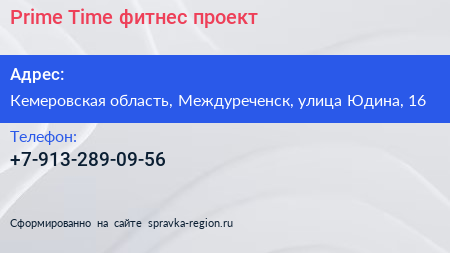 Prime Time, фитнес-проект по адресу Кемеровская область, Междуреченск, улица Юдина, 16 в дальнейшем Организация, размещена в следующих категориях: