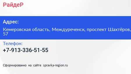 РайдеР по адресу Кемеровская область, Междуреченск, проспект Шахтёров, 57 в дальнейшем Организация, размещена в следующих категориях:
