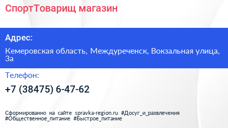 СпортТоварищ, магазин по адресу Кемеровская область, Междуреченск, Вокзальная улица, 3а в дальнейшем Организация, размещена в следующих категориях: