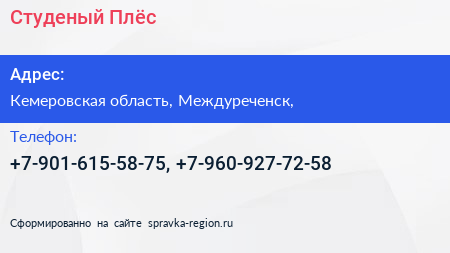 Студеный Плёс по адресу Кемеровская область, Междуреченск, в дальнейшем Организация, размещена в следующих категориях: