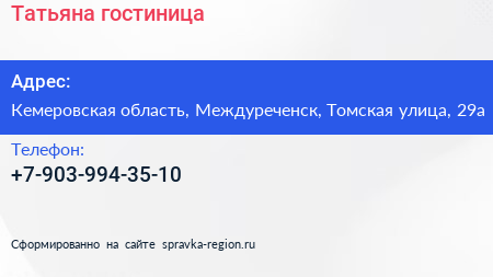 Татьяна, гостиница по адресу Кемеровская область, Междуреченск, Томская улица, 29а в дальнейшем Организация, размещена в следующих категориях: