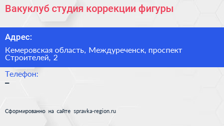Вакуклуб, студия коррекции фигуры по адресу Кемеровская область, Междуреченск, проспект Строителей, 2 в дальнейшем Организация, размещена в следующих категориях: