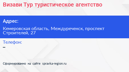 Визави-Тур, туристическое агентство по адресу Кемеровская область, Междуреченск, проспект Строителей, 27 в дальнейшем Организация, размещена в следующих категориях: