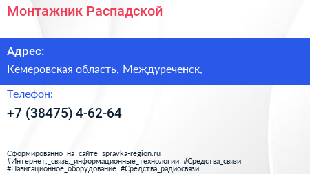 Монтажник Распадской по адресу Кемеровская область, Междуреченск, в дальнейшем Организация, размещена в следующих категориях: