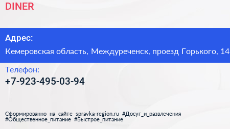 DINER по адресу Кемеровская область, Междуреченск, проезд Горького, 14 в дальнейшем Организация, размещена в следующих категориях: