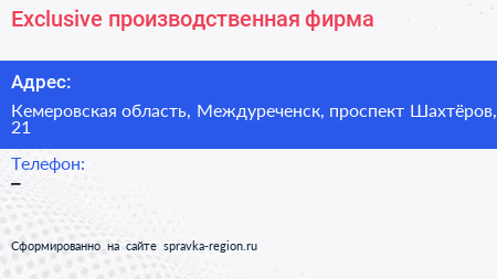 Exclusive, производственная фирма по адресу Кемеровская область, Междуреченск, проспект Шахтёров, 21 в дальнейшем Организация, размещена в следующих категориях: