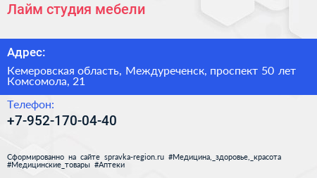 Лайм, студия мебели по адресу Кемеровская область, Междуреченск, проспект 50 лет Комсомола, 21 в дальнейшем Организация, размещена в следующих категориях: