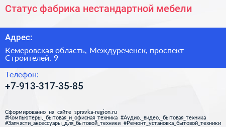 Статус, фабрика нестандартной мебели по адресу Кемеровская область, Междуреченск, проспект Строителей, 9 в дальнейшем Организация, размещена в следующих категориях: