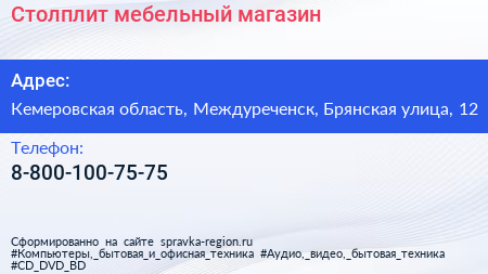 Столплит, мебельный магазин по адресу Кемеровская область, Междуреченск, Брянская улица, 12 в дальнейшем Организация, размещена в следующих категориях: