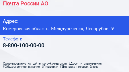 Почта России, АО по адресу Кемеровская область, Междуреченск, Лесорубов, 9 в дальнейшем Организация, размещена в следующих категориях: