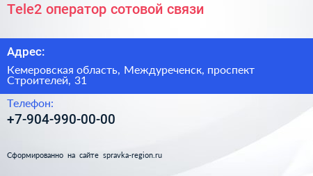 Tele2, оператор сотовой связи по адресу Кемеровская область, Междуреченск, проспект Строителей, 31 в дальнейшем Организация, размещена в следующих категориях: