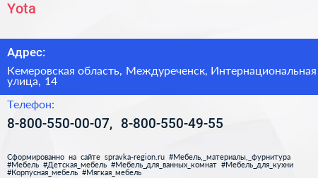 Yota по адресу Кемеровская область, Междуреченск, Интернациональная улица, 14 в дальнейшем Организация, размещена в следующих категориях: