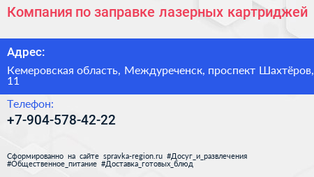 Компания по заправке лазерных картриджей по адресу Кемеровская область, Междуреченск, проспект Шахтёров, 11 в дальнейшем Организация, размещена в следующих категориях:
