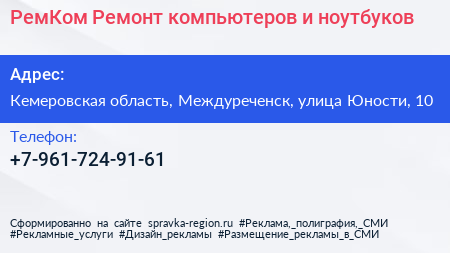 РемКом Ремонт компьютеров и ноутбуков по адресу Кемеровская область, Междуреченск, улица Юности, 10 в дальнейшем Организация, размещена в следующих категориях: