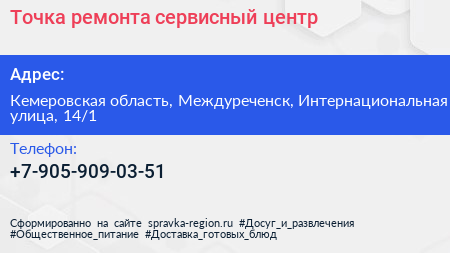 Точка ремонта, сервисный центр по адресу Кемеровская область, Междуреченск, Интернациональная улица, 14/1 в дальнейшем Организация, размещена в следующих категориях: