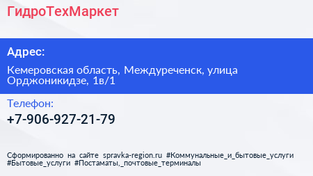 ГидроТехМаркет по адресу Кемеровская область, Междуреченск, улица Орджоникидзе, 1в/1 в дальнейшем Организация, размещена в следующих категориях: