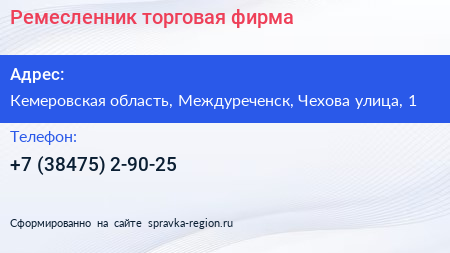 Ремесленник, торговая фирма по адресу Кемеровская область, Междуреченск, Чехова улица, 1 в дальнейшем Организация, размещена в следующих категориях: