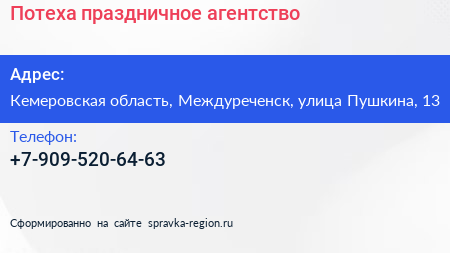 Потеха, праздничное агентство по адресу Кемеровская область, Междуреченск, улица Пушкина, 13 в дальнейшем Организация, размещена в следующих категориях: