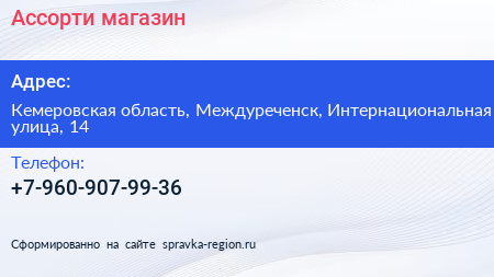 Ассорти, магазин по адресу Кемеровская область, Междуреченск, Интернациональная улица, 14 в дальнейшем Организация, размещена в следующих категориях: