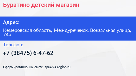 Буратино, детский магазин по адресу Кемеровская область, Междуреченск, Вокзальная улица, 74а в дальнейшем Организация, размещена в следующих категориях: