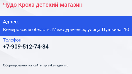 Чудо-Кроха, детский магазин по адресу Кемеровская область, Междуреченск, улица Пушкина, 10 в дальнейшем Организация, размещена в следующих категориях: