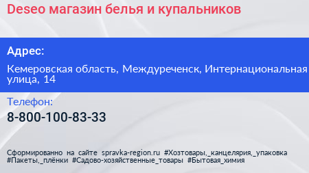 Deseo, магазин белья и купальников по адресу Кемеровская область, Междуреченск, Интернациональная улица, 14 в дальнейшем Организация, размещена в следующих категориях: