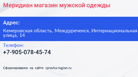 Меридиан, магазин мужской одежды по адресу Кемеровская область, Междуреченск, Интернациональная улица, 14 в дальнейшем Организация, размещена в следующих категориях: