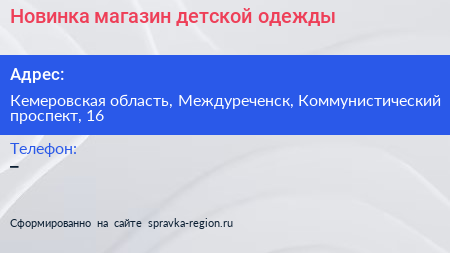 Новинка, магазин детской одежды по адресу Кемеровская область, Междуреченск, Коммунистический проспект, 16 в дальнейшем Организация, размещена в следующих категориях:
