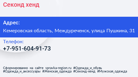 Секонд-хенд по адресу Кемеровская область, Междуреченск, улица Пушкина, 31 в дальнейшем Организация, размещена в следующих категориях: