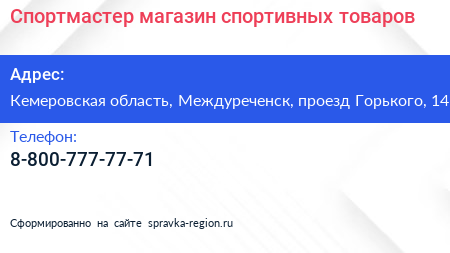 Спортмастер, магазин спортивных товаров по адресу Кемеровская область, Междуреченск, проезд Горького, 14 в дальнейшем Организация, размещена в следующих категориях: