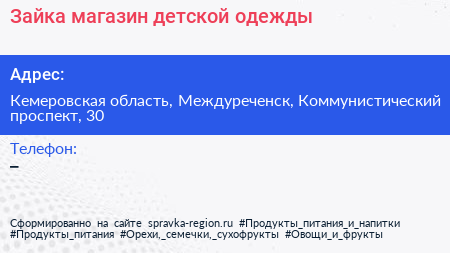 Зайка, магазин детской одежды по адресу Кемеровская область, Междуреченск, Коммунистический проспект, 30 в дальнейшем Организация, размещена в следующих категориях:
