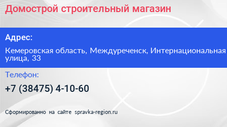 Домострой, строительный магазин по адресу Кемеровская область, Междуреченск, Интернациональная улица, 33 в дальнейшем Организация, размещена в следующих категориях: