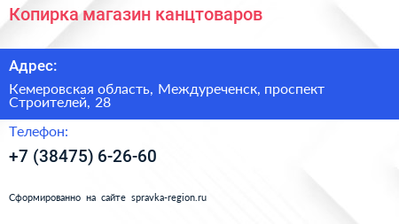 Копирка, магазин канцтоваров по адресу Кемеровская область, Междуреченск, проспект Строителей, 28 в дальнейшем Организация, размещена в следующих категориях: