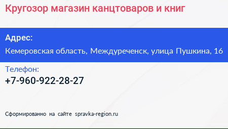 Кругозор, магазин канцтоваров и книг по адресу Кемеровская область, Междуреченск, улица Пушкина, 16 в дальнейшем Организация, размещена в следующих категориях: