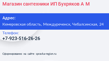 Магазин сантехники, ИП Бухряков А.М. по адресу Кемеровская область, Междуреченск, Чебалсинская, 24 в дальнейшем Организация, размещена в следующих категориях: