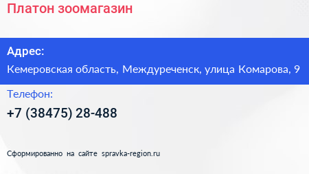 Платон, зоомагазин по адресу Кемеровская область, Междуреченск, улица Комарова, 9 в дальнейшем Организация, размещена в следующих категориях: