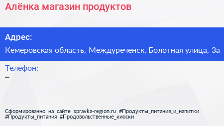 Алёнка, магазин продуктов по адресу Кемеровская область, Междуреченск, Болотная улица, 3а в дальнейшем Организация, размещена в следующих категориях: