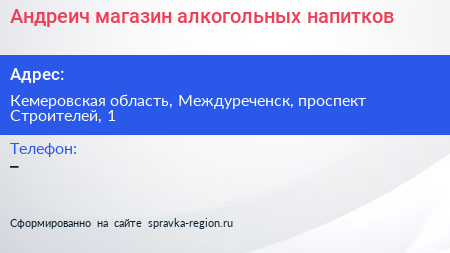 Андреич, магазин алкогольных напитков по адресу Кемеровская область, Междуреченск, проспект Строителей, 1 в дальнейшем Организация, размещена в следующих категориях: