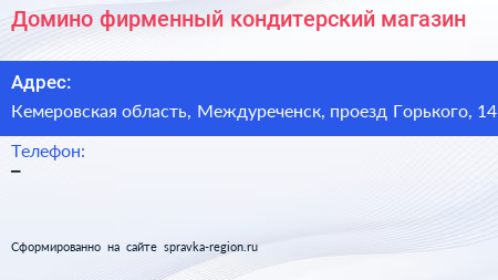 Домино, фирменный кондитерский магазин по адресу Кемеровская область, Междуреченск, проезд Горького, 14 в дальнейшем Организация, размещена в следующих категориях: