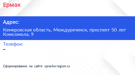 Ермак по адресу Кемеровская область, Междуреченск, проспект 50 лет Комсомола, 9 в дальнейшем Организация, размещена в следующих категориях: