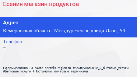 Есения, магазин продуктов по адресу Кемеровская область, Междуреченск, улица Лазо, 54 в дальнейшем Организация, размещена в следующих категориях: