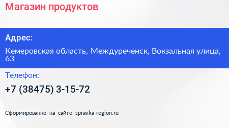 Магазин продуктов по адресу Кемеровская область, Междуреченск, Вокзальная улица, 63 в дальнейшем Организация, размещена в следующих категориях: