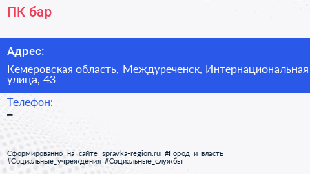 ПК, бар по адресу Кемеровская область, Междуреченск, Интернациональная улица, 43 в дальнейшем Организация, размещена в следующих категориях: