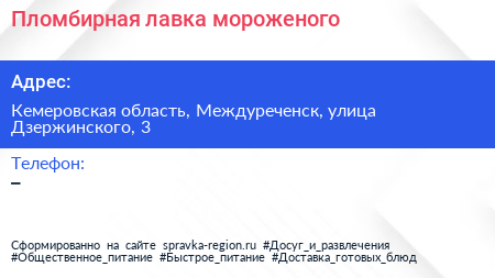 Пломбирная, лавка мороженого по адресу Кемеровская область, Междуреченск, улица Дзержинского, 3 в дальнейшем Организация, размещена в следующих категориях: