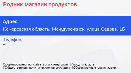Родник, магазин продуктов по адресу Кемеровская область, Междуреченск, улица Седова, 1Б в дальнейшем Организация, размещена в следующих категориях:
