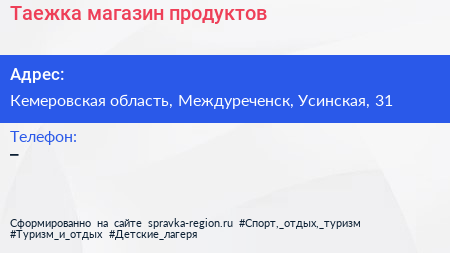 Таежка, магазин продуктов по адресу Кемеровская область, Междуреченск, Усинская, 31 в дальнейшем Организация, размещена в следующих категориях: