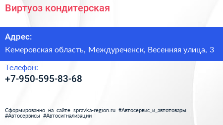 Виртуоз, кондитерская по адресу Кемеровская область, Междуреченск, Весенняя улица, 3 в дальнейшем Организация, размещена в следующих категориях: