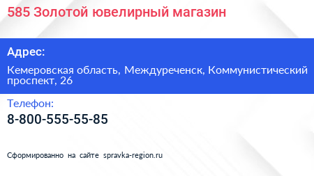 585 Золотой, ювелирный магазин по адресу Кемеровская область, Междуреченск, Коммунистический проспект, 26 в дальнейшем Организация, размещена в следующих категориях: