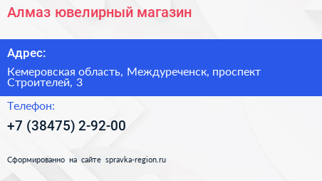 Алмаз, ювелирный магазин по адресу Кемеровская область, Междуреченск, проспект Строителей, 3 в дальнейшем Организация, размещена в следующих категориях: